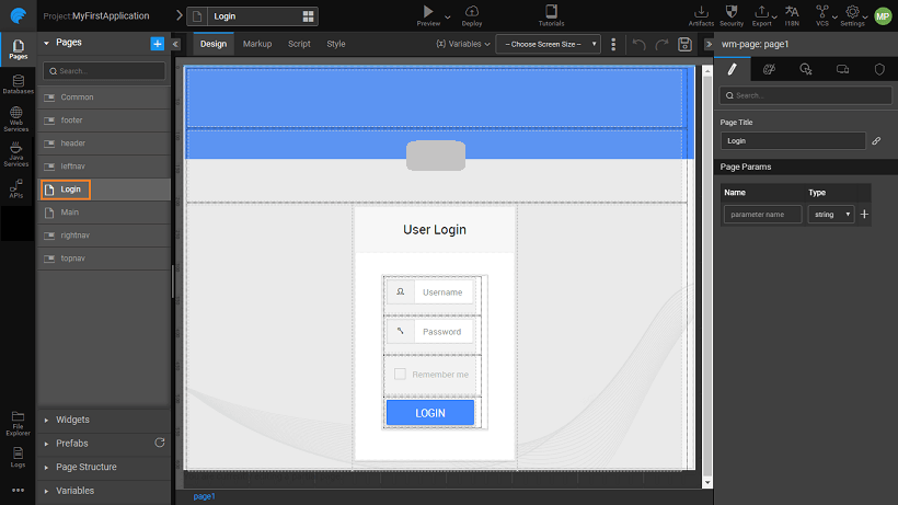 • Select the page container and change the Class name and Image location from the Style property to change the background image and style